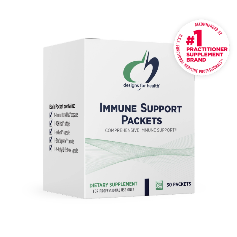 Combines the power of five different Designs for Health immune-supportive products: Immunitone Plus™, ADK Evail™, Stellar C™, Zinc Supreme™, and N-Acetyl-L-Cysteine.*