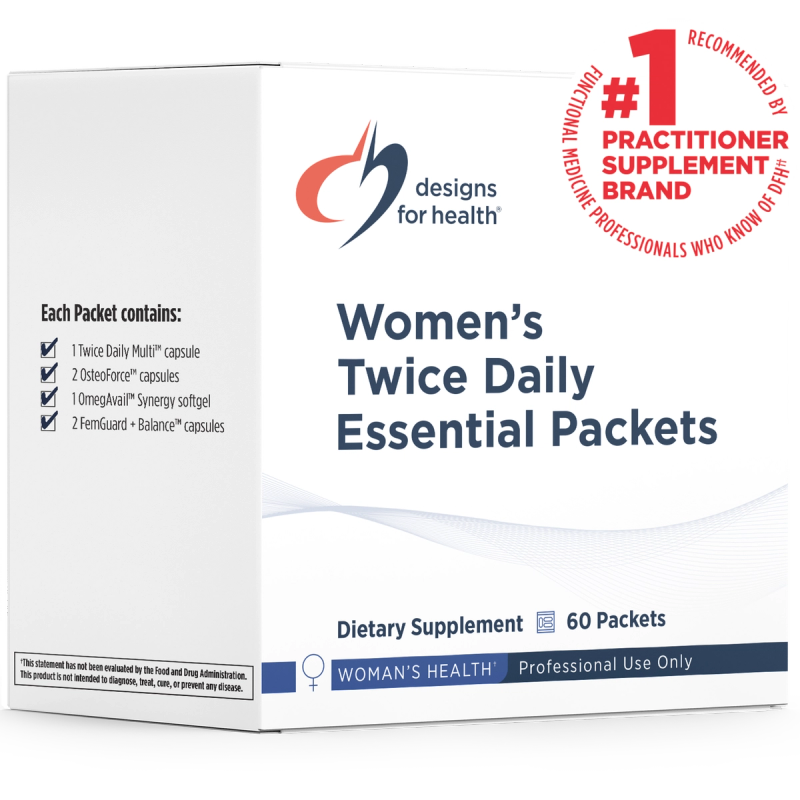 Women's Twice Daily Essential Packets provide a high-quality multivitamin/multimineral and essential fatty acid blend to support overall nutritional balance.* The packets also include targeted nutrients to support bone health and female hormonal balance, particularly estrogen, addressing key aspects of women’s health across life stages.* This convenient packet format makes comprehensive nutritional support simple for both foundational maintenance and new supplement users.* These packets do not contain iron, making them suitable for women of all ages.*